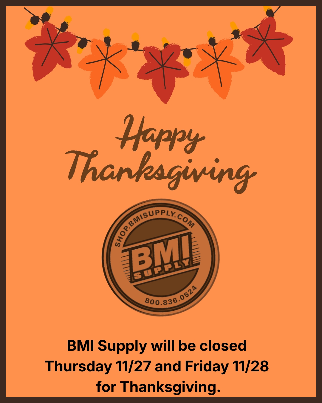 BMI Supply will be closed from Thursday, November 27th until Friday, November 28th for Thanksgiving. We will resume normal business hours on Monday, December 1st.