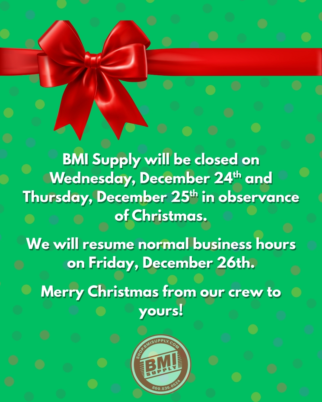 BMI Supply will be closed on Wednesday, December 24th & Thursday, December 25th in observance of Christmas. We will resume normal business hours on Friday, December 26th.